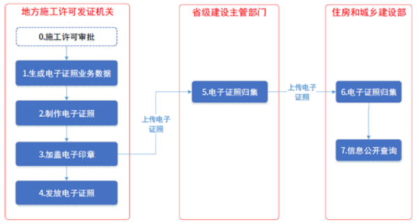 三、實現(xiàn)電子證照信息歸集。地方施工許可發(fā)證機(jī)關(guān)應(yīng)在發(fā)證后5個工作日內(nèi),將電子證照文件(含電子印章)及業(yè)務(wù)信息上傳至省級建筑市場監(jiān)管一體化工作平臺。省級建筑市場監(jiān)管一體化工作平臺每個工作日應(yīng)對本行政區(qū)域內(nèi)的信息進(jìn)行匯總,并通過部省數(shù)據(jù)對接機(jī)制上傳至全國建筑市場監(jiān)管公共服務(wù)平臺(以下簡稱公共服務(wù)平臺)。公共服務(wù)平臺進(jìn)行歸集和存檔,并按要求向國家政務(wù)服務(wù)平臺報送。
